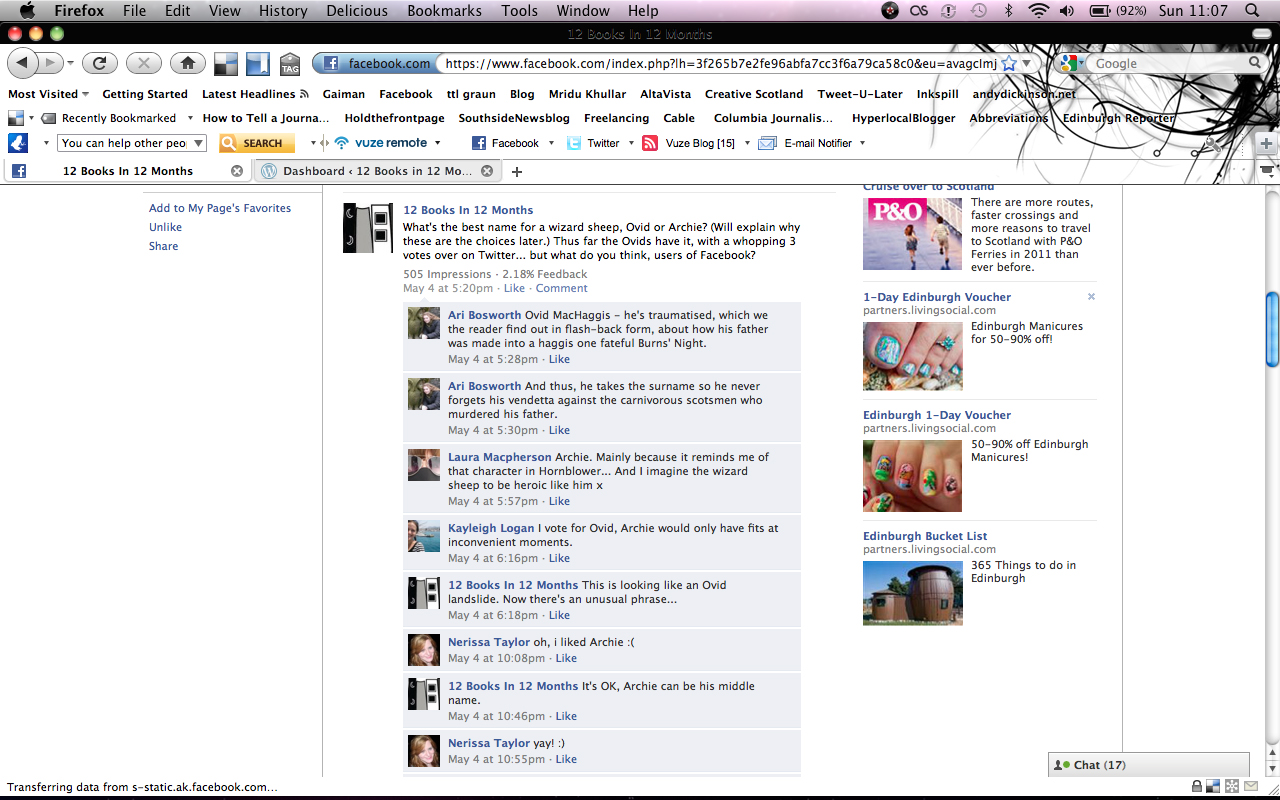 In amongst all the adverts I found my answer – ‘Ovis Aries’. Naturally the first two names that came to mind that sound a bit like these were ‘Ovid’ and ‘Archie’ – both of which could work. Ovid, Roman poet who was very popular in the middle ages, unusual first name which could mark him out as special; and Archie, short for Archibald, a fairly old fashioned name meaning ‘brave’ which this sheep will have to be in order to complete his quest. Whatever that is.