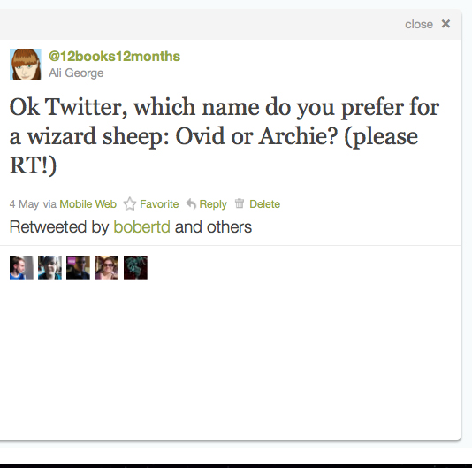 But when someone else comes up with your character for you, it’s a little bit harder to name them. I am in the process of writing book five, and before I started I had a suggestion from the lovely Arielle Bosworth (click her name to go to her blog) that “your protagonist should be a talking sheep who is also a wizard. It could be amazing.”