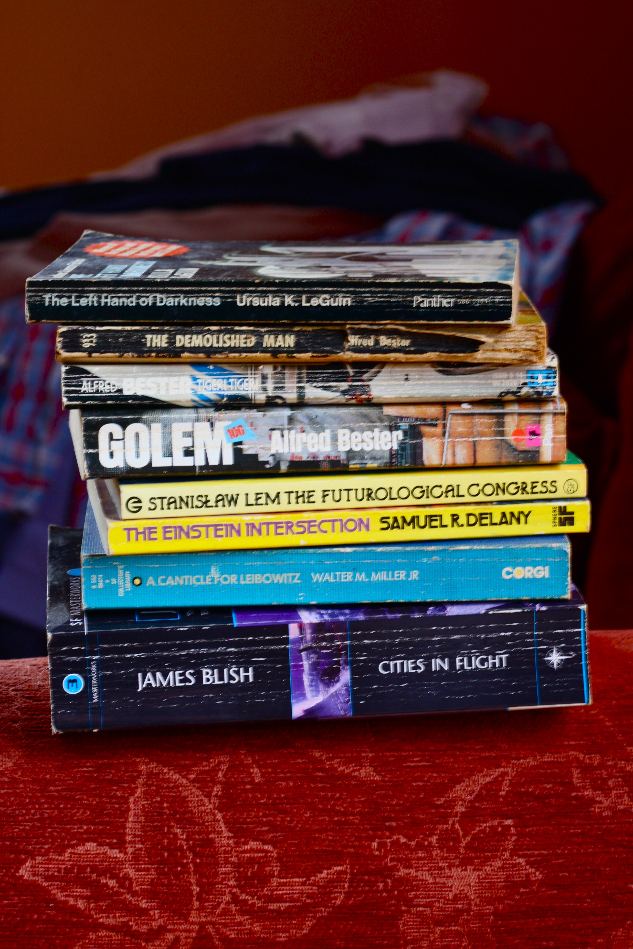 Most of the science fiction I’ve read is YA (that stands for Young Adult, for those who dislike acronyms) or Graphic Novels, so my dad has given me a small pile of classics to look at, which you will see on the left of the page.