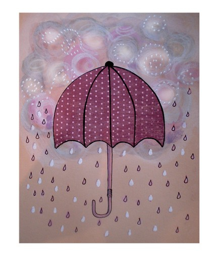 The little girl carries a bright green umbrella with frogeyes on top of it, and she’s wearing a red mackintosh and yellow wellington boots. This colour combination reflects in the raindrops bouncing off her umbrella, cutting through the grey air and creating a warm glow around her.