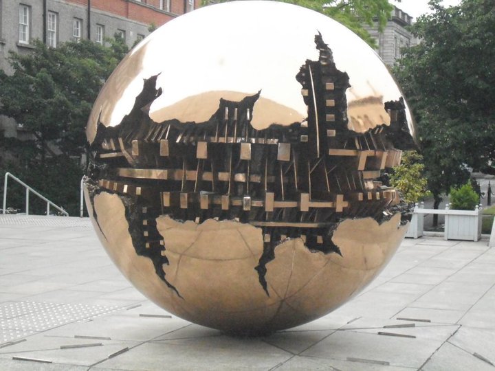 We look at the sphere again; scaffold ribs poking through gaps in gold coloured skin, humming ominously in the late afternoon sunshine.
