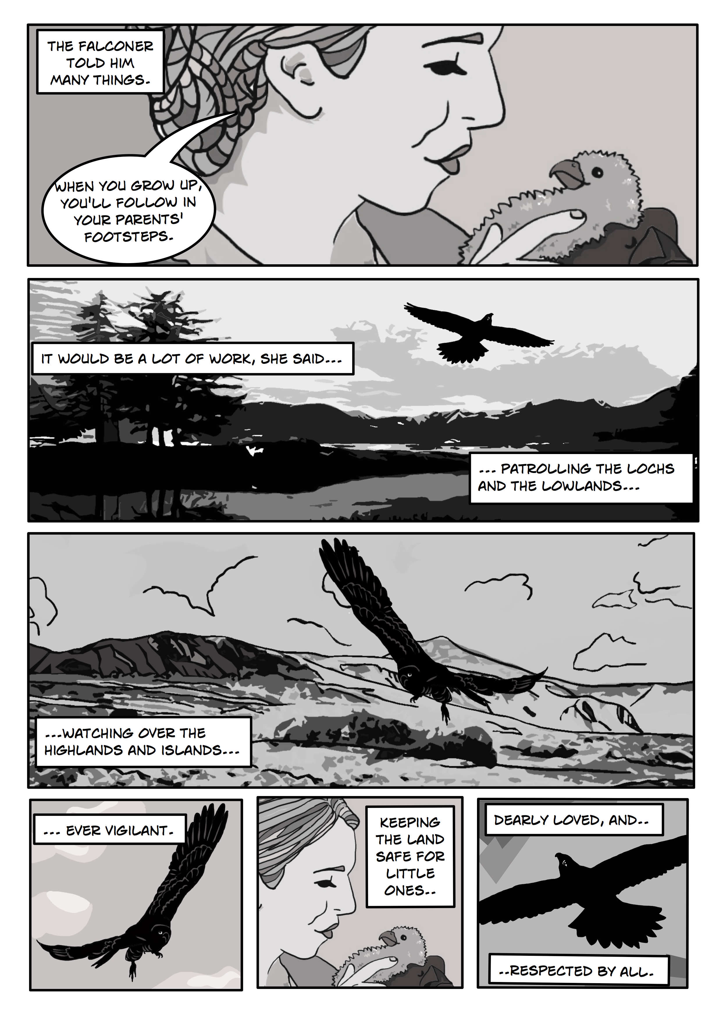 Page 4, in which the falconer tells the falcon a bit about his parents, his roots, and his destiny. He is old money, like the royals – a lot of responsibility is going to be coming his way soon.