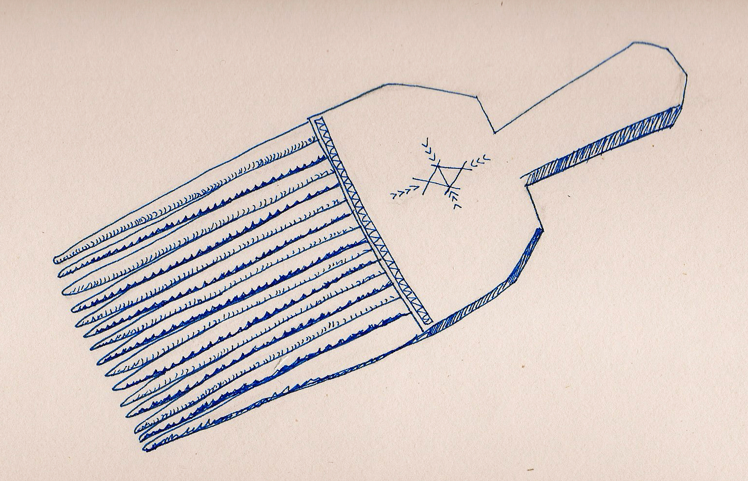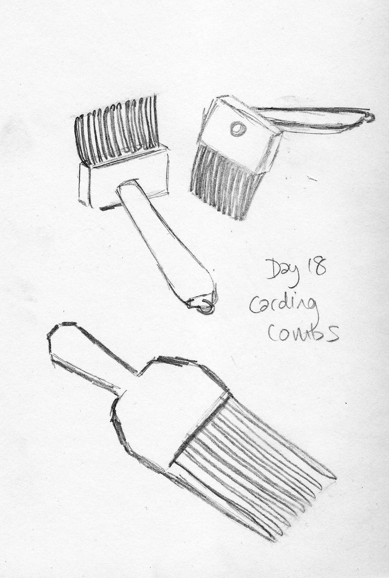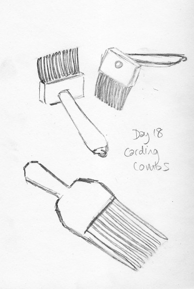 Then we have some more carding combs. You may remember the other day I did a golden hair comb, without actually referring back to the text of the story, only to discover that the gift wasn’t a hair comb at all but the kind used for getting icky bits out of sheep’s wool when you’re going to spin it into thread. This makes sense in the context of the spinning wheel, but it’s not the most magical looking item… nowadays the things used for carding are a bit like giant hair brushes, but I managed to find a couple of more old fashioned looking ones to sketch.