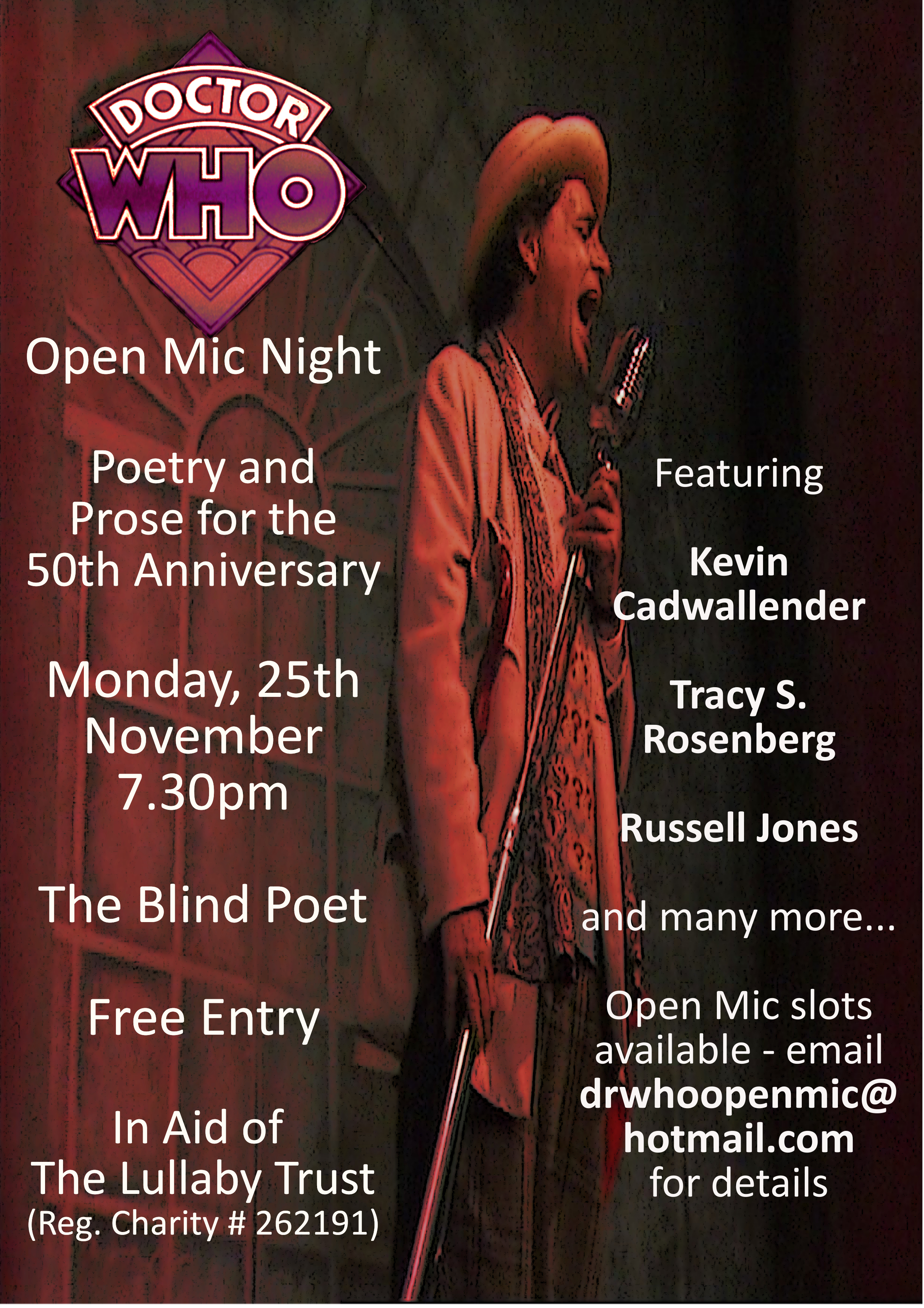 Organised by my good friend Andrew Blair and the chaps behind Blind Poetics*, the truthfully titled ‘The Doctor Who Open Mic Night’ is coming to Edinburgh pub The Blind Poet on November 25th. Join performers Kevin Cadwallender, Tracey S. Rosenberg and Russell Jones as they celebrate the Fiftieth Anniversary of Doctor Who through spoken word. And as you do it, you can help raise money for The Lullaby Trust, an amazing charity that supports bereaved families.