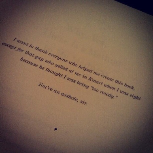 Dedications are often slightly boring – ‘for [insert relative here]’ type messages, but occasionally they’re revealing, or hilarious, or heartbreaking. An internet (and personal) favourite is from Jenny Lawson‘s excellent book Let’s Pretend This Never Happened: