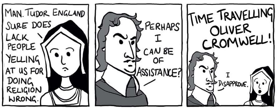 Now, I haven’t read Wolf Hall yet but I am aware that it is about Tudor England. As such, Oliver Cromwell (born in 1599, died in 1658 – September) probably isn’t too heavily involved. Rylance is in fact playing Thomas Cromwell (born around 1485, died in 1540), who is not the same person at all. However, this mistake did give me this idea for a quick comic – so all’s well that ends well.