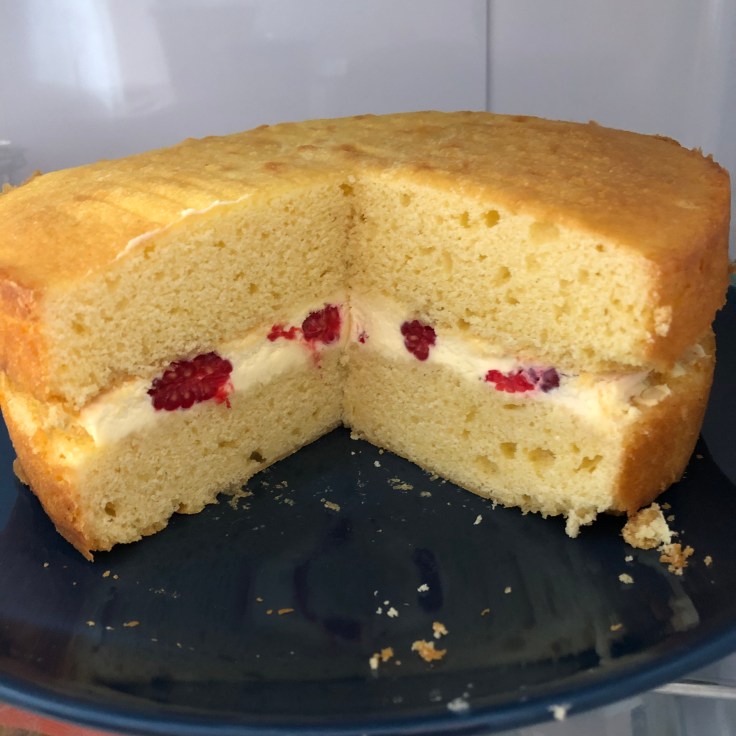 I also made an enormous sponge cake. The picture doesn’t do it justice. This is noteworthy not because it was particularly good but because I was able to do it when the bairn was awake and in my sole custody. It felt like a bit of a revelation to be honest.